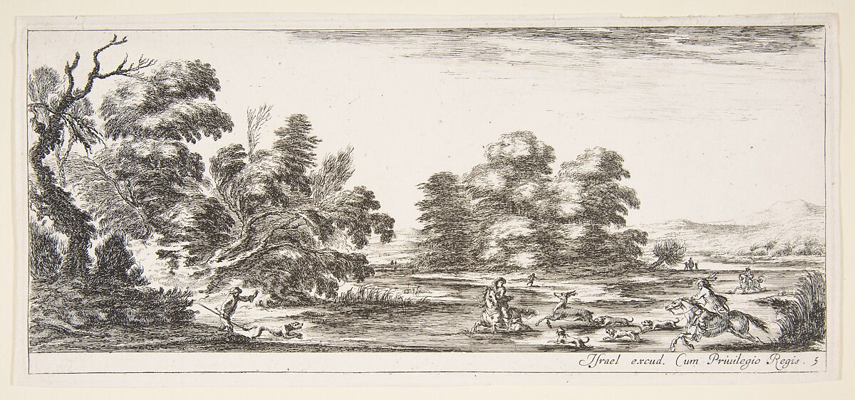 Plate 5: two horsemen in a stream to right, riding towards the left, following four dogs chasing a stag, another dog running into the water from the left, from 'Various landscapes' (Divers paysages)
