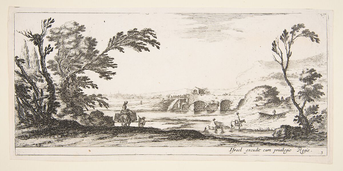 - Title: Plate 3: two horsemen crossing a river to right, a woman with two baskets atop a donkey to left, trees to the left and right, a bridge in the background, from 'Various landscapes' (Divers paysages)