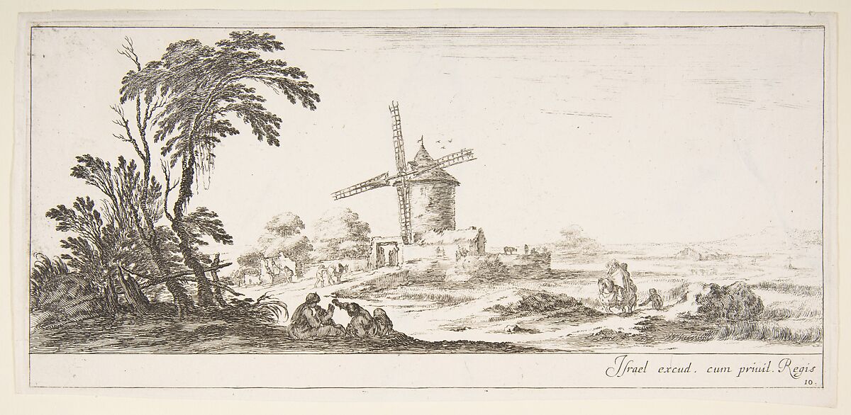 - Title: Plate 10: a family in center foreground, various figures and horses in middleground, a windmill in center background, from 'Various landscapes' (Divers paysages)