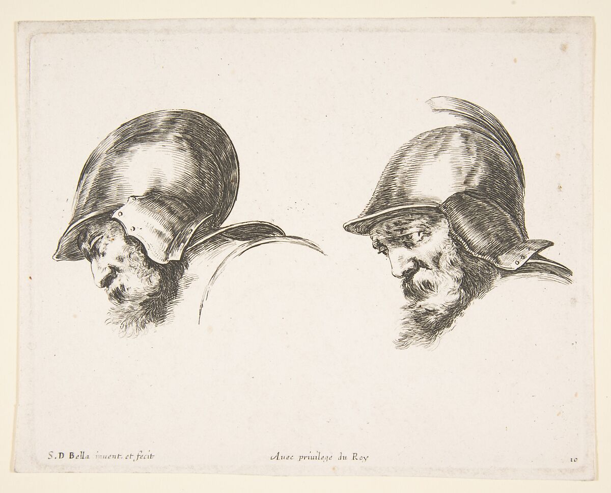 - Title:Plate 10: two heads of old soldiers wearing helmets, both facing left and looking downwards, from "The principles of design" (I principii del disegno)