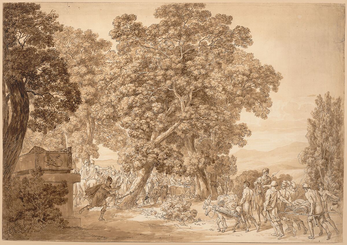 This drawing is a most impressive example of Mechau's mature style and can be dated to the end of the eighteenth century, when the artist's compositions were moving away from the influence of Claude Lorrain, who generally treated the human element in his landscapes as mere staffage. Here, the towering trees are given no greater importance than the scene depicted underneath. The subject of the drawing is explained by a 1785 poem by the German poet and philosopher Johann Gottfried Herder (1744-1803), inscribed on the back of the sheet, probably in the artist's own hand. A cowardly Phrygian soldier, who only dares to threaten the Trojan hero Ajax when he is dead and buried, jumps backward when Ajax shouts to him from his grave. It is not known for what purpose the drawing was made. A drawing by Mechau at the Albertina, Vienna, is also inscribed with a poem by Herder.