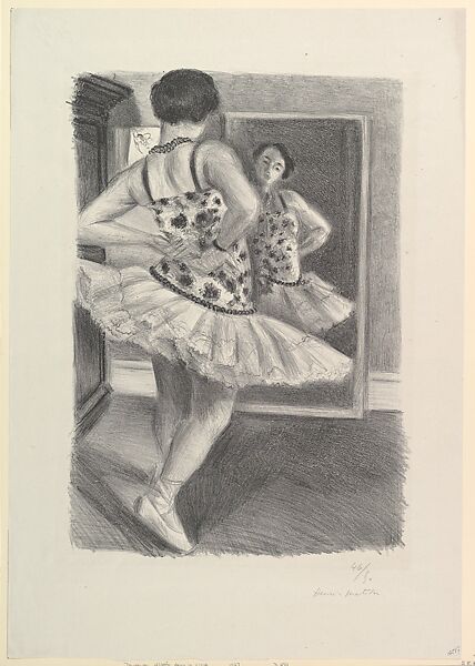 Lithograph depicting a female ballet dancer in front of a mirror, wearing a white leotard with black straps and parches, white tutu, stockings, and ballet shoes.