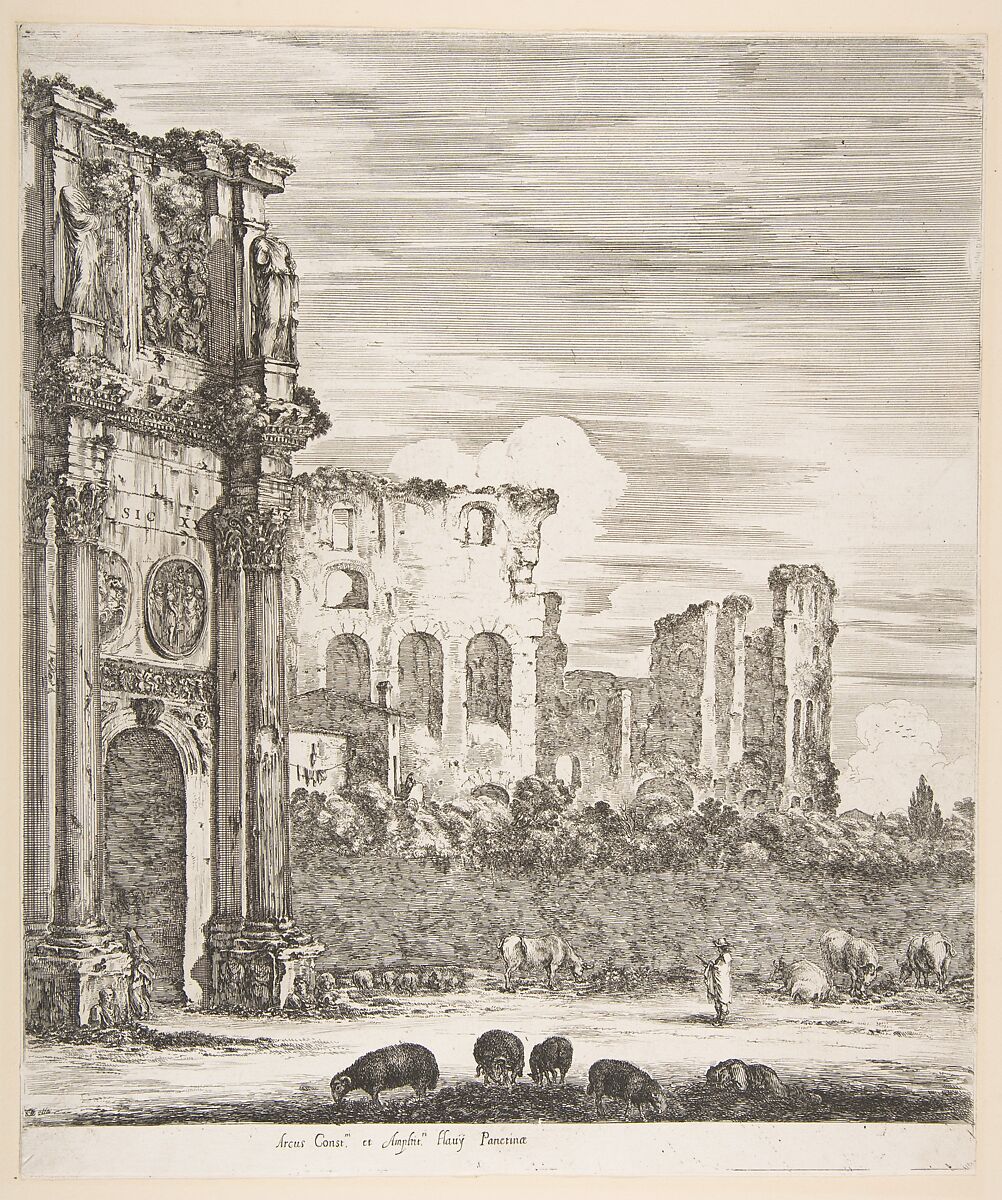 - Title: Arch of Constantine and Colosseum with sheep grazing in foreground, from "Six large views, four of Rome, and two of the Roman countryside" (Six grandes vues, dont quatre de Rome et deux de la Campagne romaine)