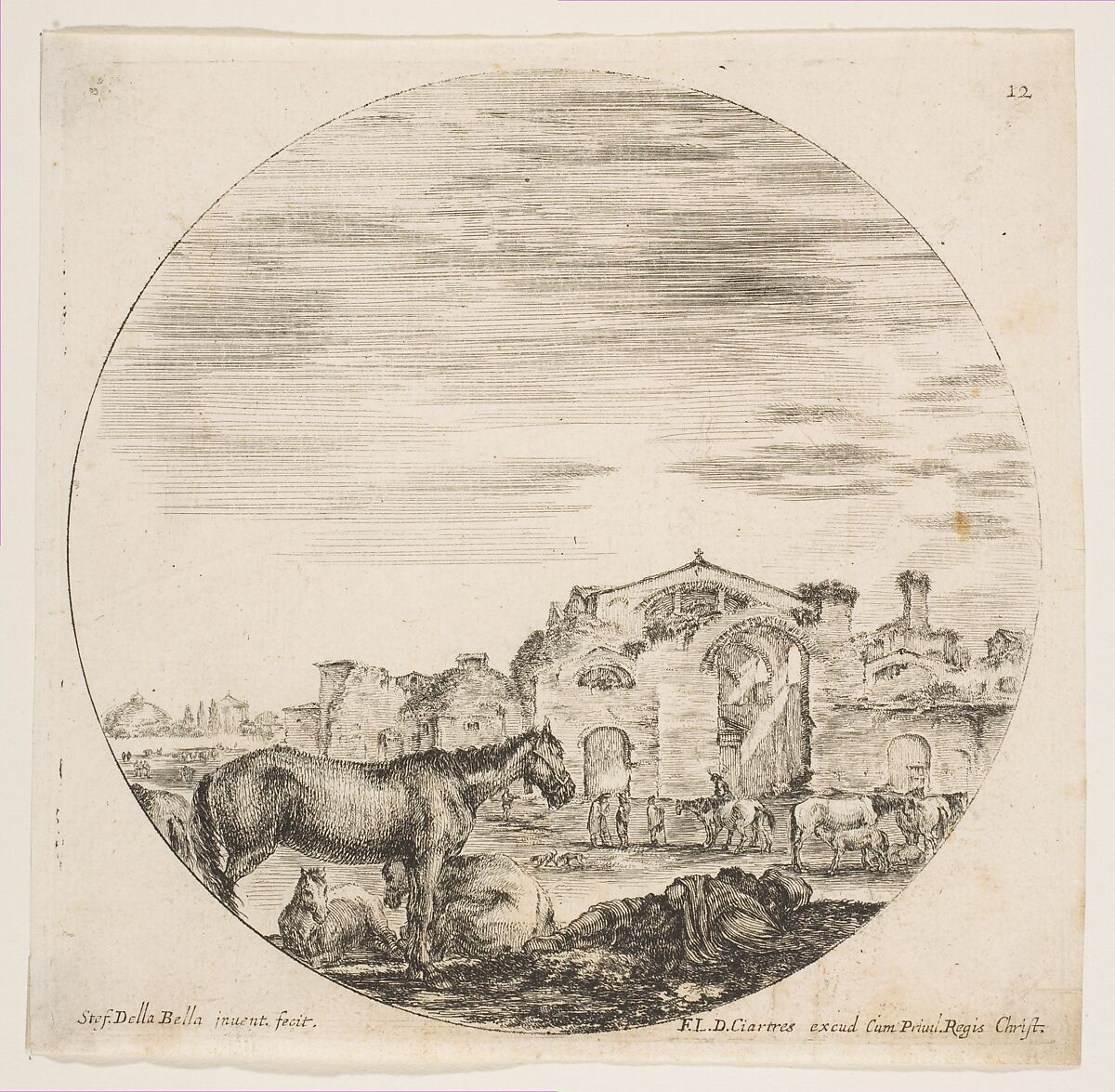 - Title: A shepherd sleeping on the ground at right, three horses at left, other horses and various figures to right, the Baths of Diocletian in the background, plate 12 from "Roman landscapes and ruins" (Paysages et ruines de Rome)