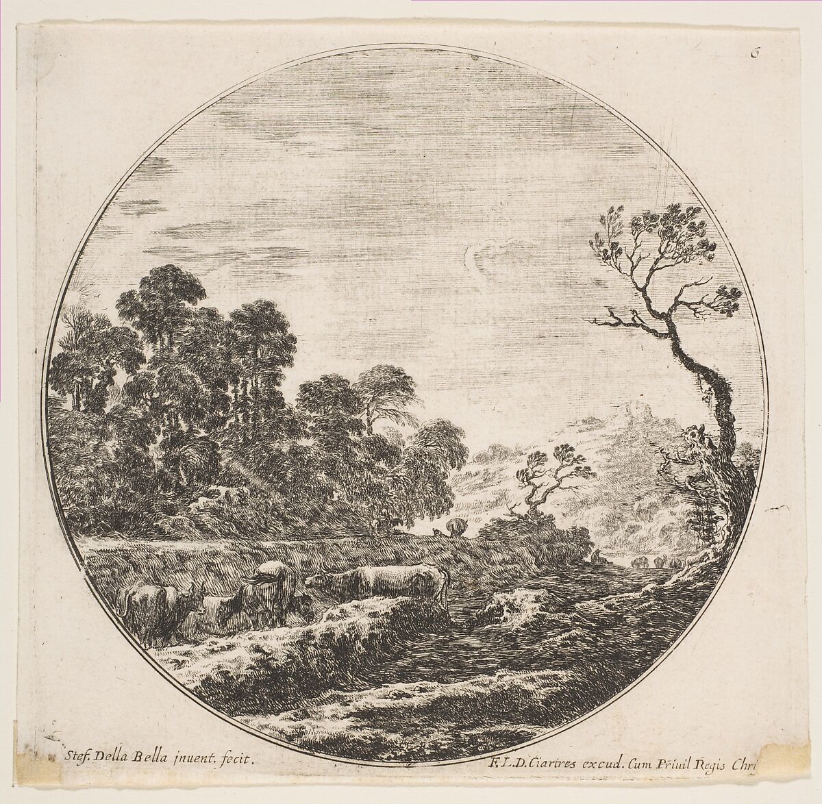 - Title: Cows crossing a valley at left, a horseman and other cows in the background, plate 6 from "Roman landscapes and ruins" (Paysages et ruines de Rome)