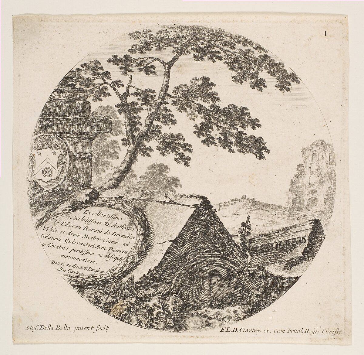 During Della Bella’s stay in Rome from 1633 to 1639, he filled sketchbooks with drawings of ancient ruins and surrounding landscapes. The sketches served as inspiration for this series of thirteen etchings, which he completed around 1646, after he moved to Paris. Della Bella returned to this subject matter in 1656, when he completed six larger, more detailed etchings of Rome.
