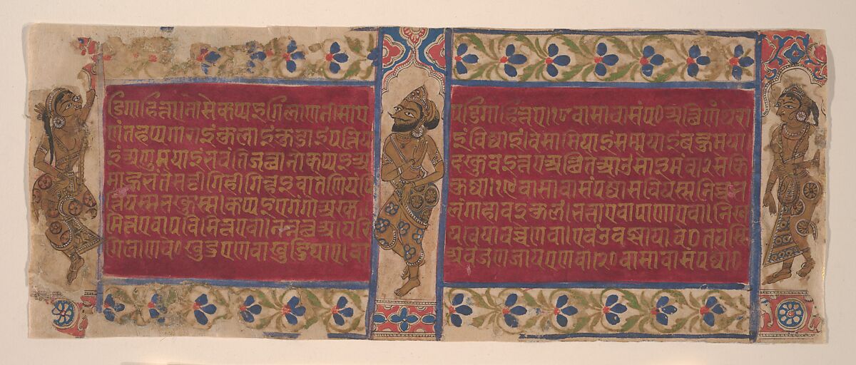 In Jain cosmology, Shakra's heaven is a blissful place where the jinas reside for eternity. It is populated by celestial dancers, seen here as beautiful maidens sensuously poised in the text margins. On the lower folio a male dancer accompanies the female dancers. These scenes are echoed in the textual descriptions of the Kalpasutra celebrating the jina Mahavira. The manuscript displays innovative use of red, blue, and green marginal designs that anticipate sixteenth-century styles and a lavish use of gold script on a red ground.