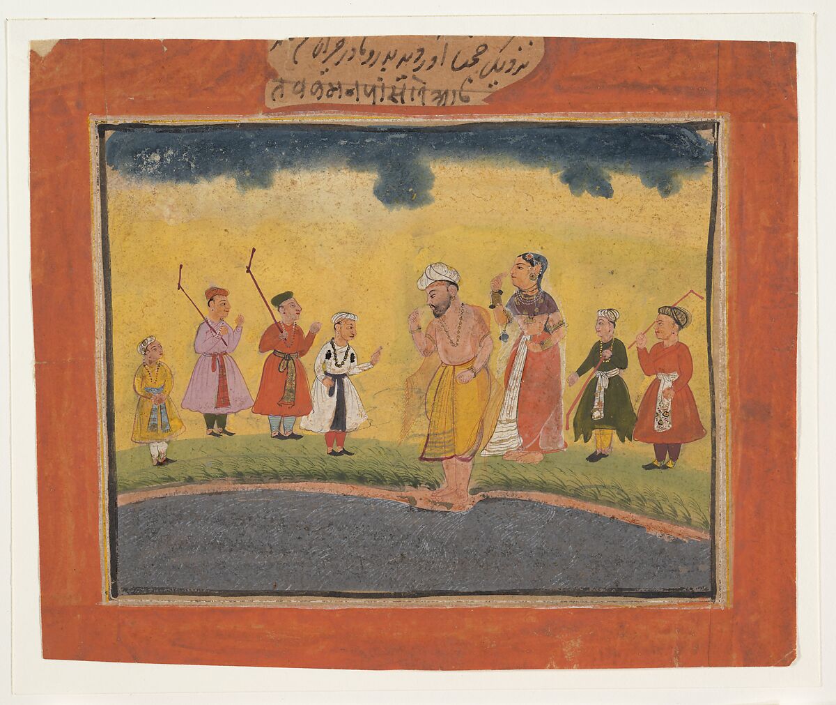 Krishna's foster parents, Yashoda and Nanda search for him after he has jumped into the Yamuna River. The surrounding figures are cowherder friends with whom Krishna had been playing a ball game. Works in provincial versions of the Mughal style were probably made for the lesser Mughal nobility at court as well as for the Rajasthani feudatory rulers.