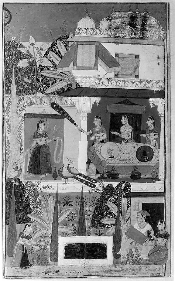 The conventions of this ragini vary, but the usual theme is a lady waiting for her lover. Here, she stands at the door, possibly looking out for him. This analysis is buttressed by the empty bed and the actions of her handmaidens, who attempt to cool and placate her. Hindu court poets invented extensive typologies of women and their lovers. These types appear in music, dance, devotional poetry, and secular literature as well as in painting.