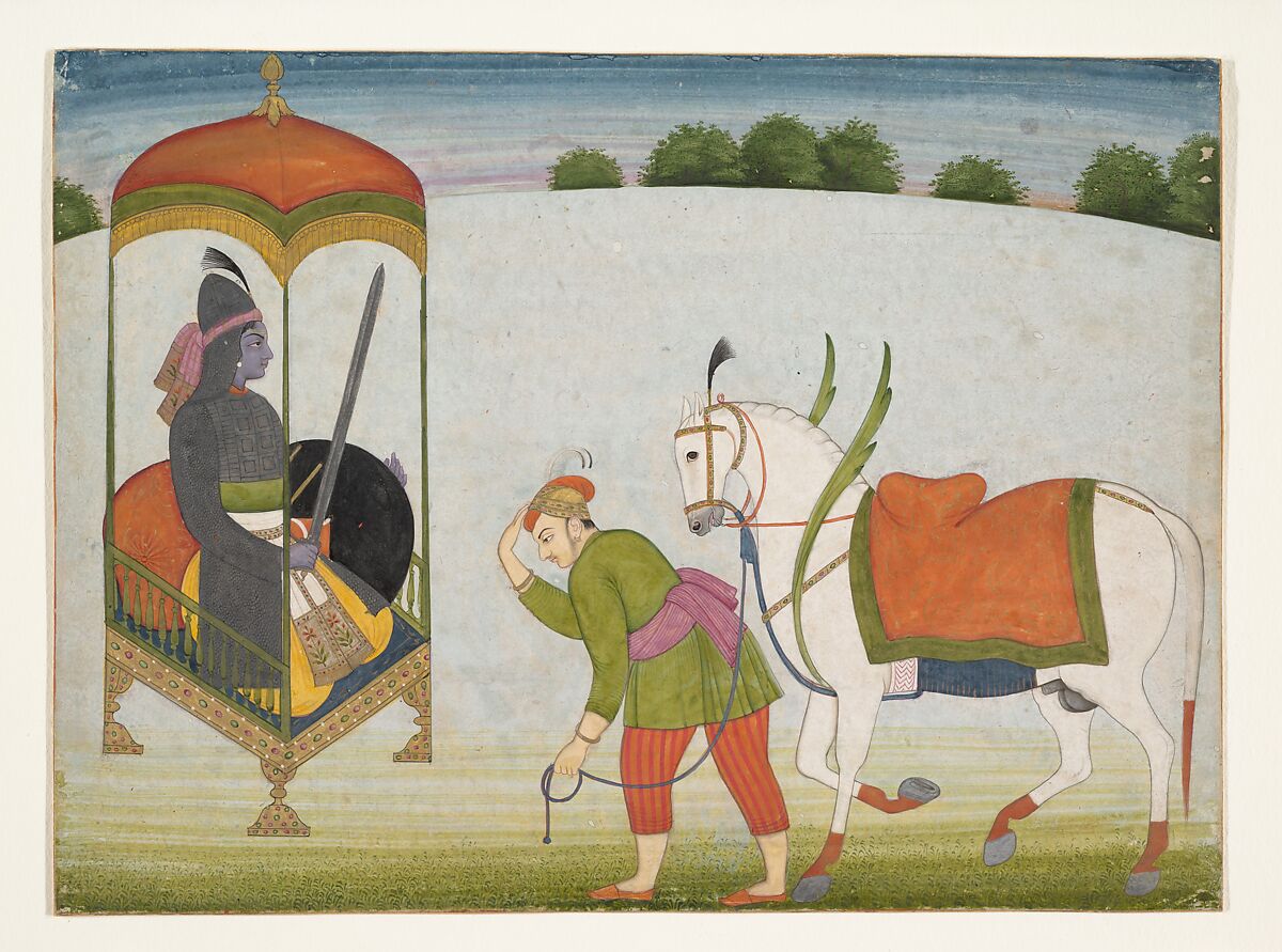 It is interesting to compare this version of Kalki Avatar with an earlier Basohli example (1991.32.1) in the collection. The basic format is the same, though the entire composition has been flopped. The Basohli work probably formed the inspiration for the present one. Here, the shallower space of the earlier picture has become deeper. The groom and horse inhabit the foreground; the hero, the middle ground; and the hilltop and distant trees, the background. The hero's throne and fringed canopy are shown in an incipient perspective. The color is more naturalistic and the setting has a tangible sense of reality. Only the golden wings of the horse are new and fabulous.