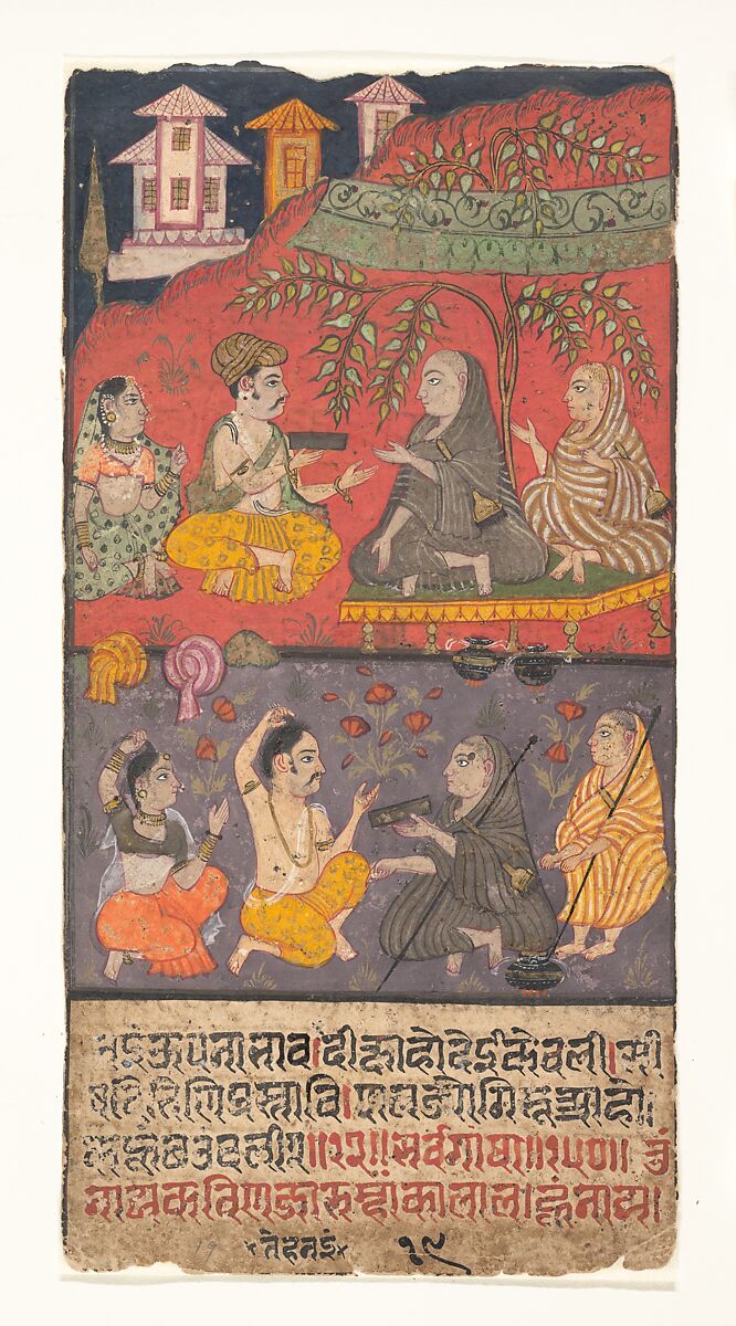 In the upper register, the Jain Shalibhadra, born to great wealth, and his wife present a manuscript to two Jain nuns (or perhaps “widows” of renunciants) seated beneath a decorated tree that has leafy branches in the form of creepers found in Malwa paintings. In the lower scene, which is set on a contrasting ground, they pull out their own hair—an act of renunciation (diksa) that is the first step to embarking on life as a monk or nun. The painting contains many early Rajput conventions in terms of the depiction of space and the color palette employed, while the figural type can be compared to Marwar production.
