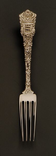 This fork was a sample piece from the 918-piece flatware service ordered by John W. Mackay and made from the silver of his own mine in the Comstock Lode of Nevada. The custom-designed service for twenty-four people was ordered for Mackay’s wife, Maria Louise. Each piece bears her monogram and the coat of arms of her father's family, the Hungerfords.