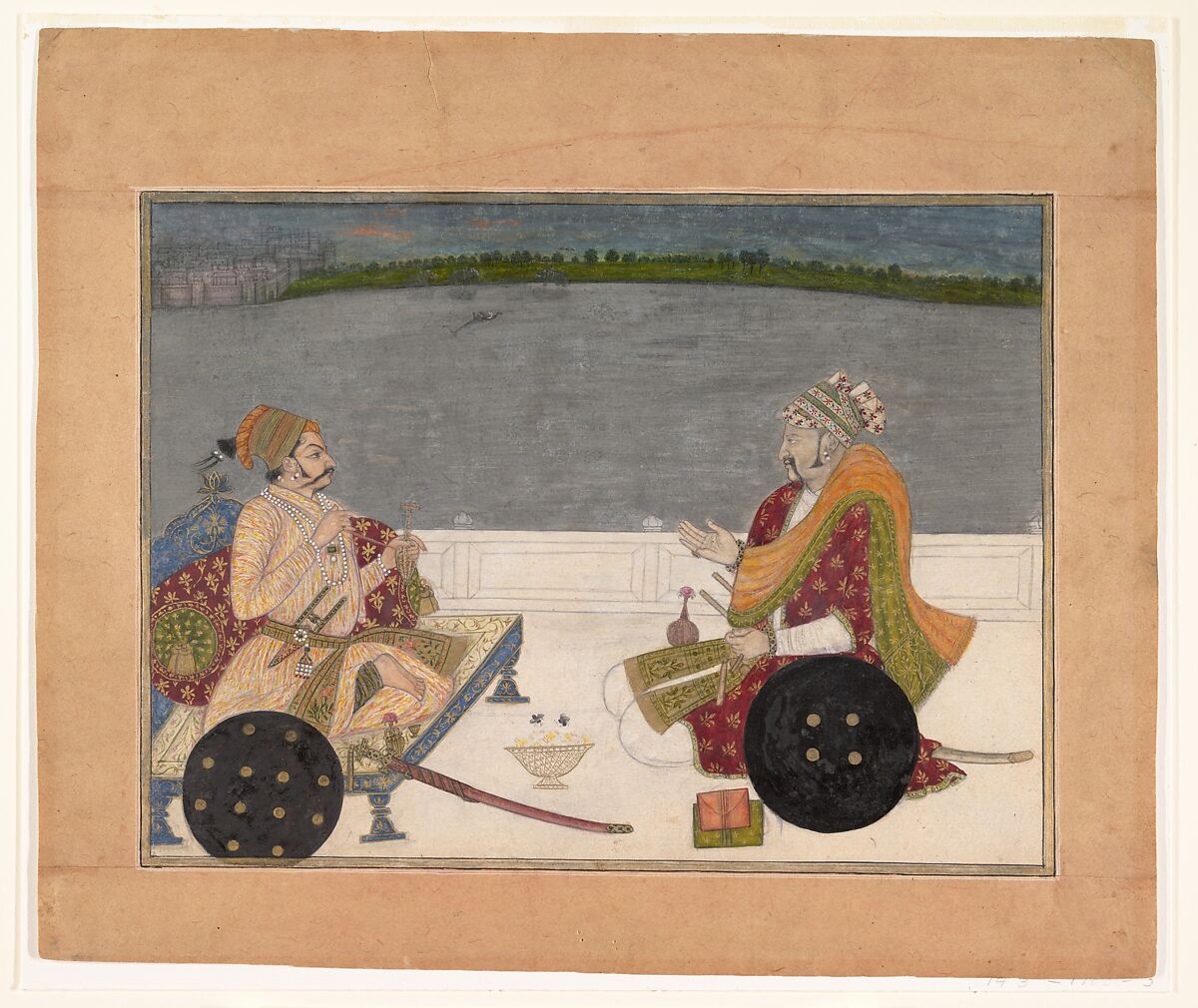 The Kishangarh school of painting emerged in the early eighteenth century, likely stimulated by a surplus of Mughal atelier-trained artists who were seeking employment at the time of the accession of Muhammad Shah in Delhi. Initially the Kishangarh court style emulated that of contemporaneous Mughal production, but under the inspired directorship of the painter Bhavani Das, who arrived at the court from Delhi in 1719, it quickly assumed a distinctive character. The early Kishangarh school flourished under Bhavani Das and his son Dalchand. This work is unsigned but such is its skill in capturing individual physiognomies and the psychological interplay between the two figures that it may confidently be assigned to either Bhavani Das or Dalchand. It is inscribed on the reverse in both Hindi and Persian, naming the two figures, and characterizing Gordhar as “a singer of good songs.” The scene is set on a palace terrace with a low white marble balustrade, overlooking a silvered lake in the afterglow of an early evening.