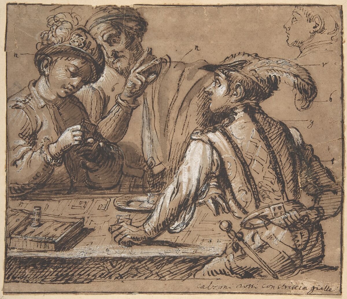 This powerfully rendered scene of Cardsharps by a game table is based on a composition by Caravaggio of the same subject (Kimbell Art Museum, Fort Worth), painted about 1595-1600, but is not an exact reprise of the painting. The sheet includes at upper right a separate, summary sketch of the head of the same young man, who sits by the table at right in the more fully developed main scene. The drawings on the sheet are done with an unusually expressive handling of the pen and very bold chiaroscuro, qualities that indicate that this was from a sheepish copyist of Caravaggio. The sheet is inscribed at bottom right in pen and the similar color ink as the drawing, "calzoni rossi con striscie gialle" (red pantaloons with yellow stripes). The figures are annotated with letters (clockwise from left), "n," "b," "n," "v," "b," "g." ["r" ?]. These are color notes (nero, bianco, nero, verde, bianco, grigio, rosso). The fact of the annotations further confirms that this is after a painting. Alfred Moir and Frederick Den Broeder have suggested this drawing is possibly by a Northern artist of ca. 1600, but to the present compiler the draftsman is more likely Italian (also because of the idiomatic color notes). The influence of Agostino Carracci seems notable. (CCB, 2009)