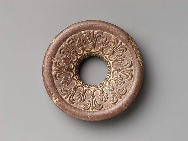Recent finds of gold foil alongside finely carved discs suggest ring and disc stones were jewelers’ molds. Their designs incorporate honeysuckle and lotus, signs of auspiciousness and abundance. The Hellenized honeysuckle, introduced to India from Persia, had a popular local equivalent, the snake flower (nagapuspa).