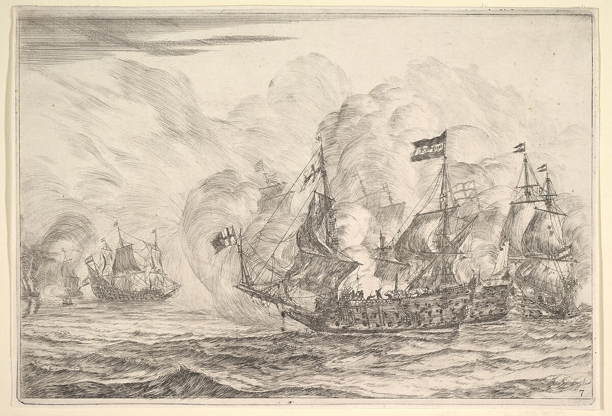 Naval Encounter with Three Vessels on the Right, from Naval Battles (Nieuwe Scheeps Batalien), plate 7