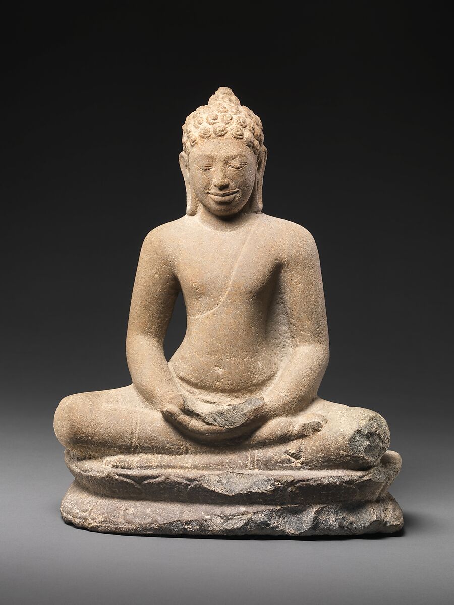 This is one of a small group of early Southeast Asian Buddhas. The figure sits in a cross-legged posture with his hands in a gesture signifying meditation (dhyanamudra). The statue is in a style of the seventh century associated with the Mekong Delta and the Zhenla kingdom.