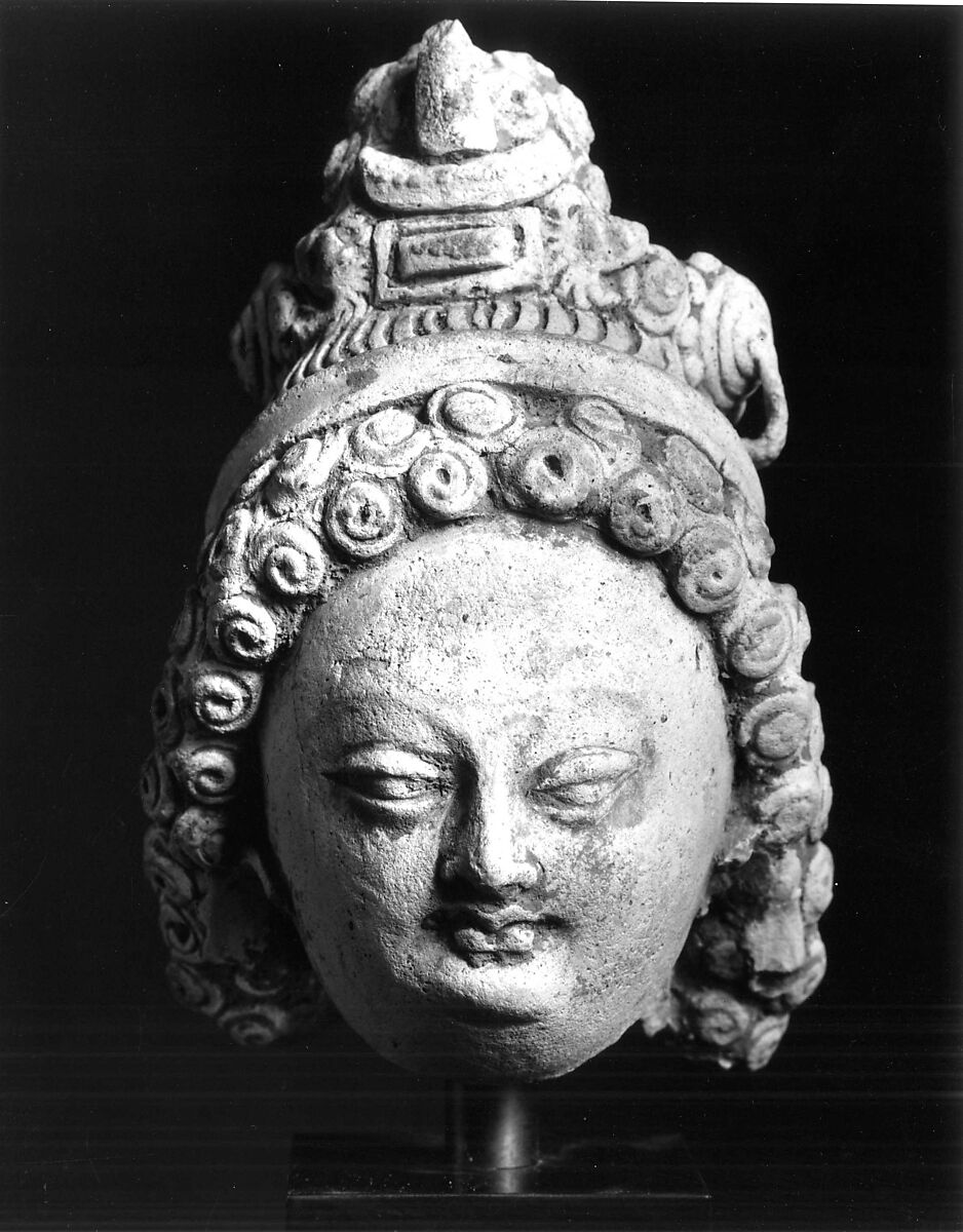 The long curly hair and the roundels with pendant chains on either side of the crown are often found in representations of bodhisattvas and devotees produced in the Turfan area and in the Dunhuang region of northwestern China from the eighth through the ninth century.