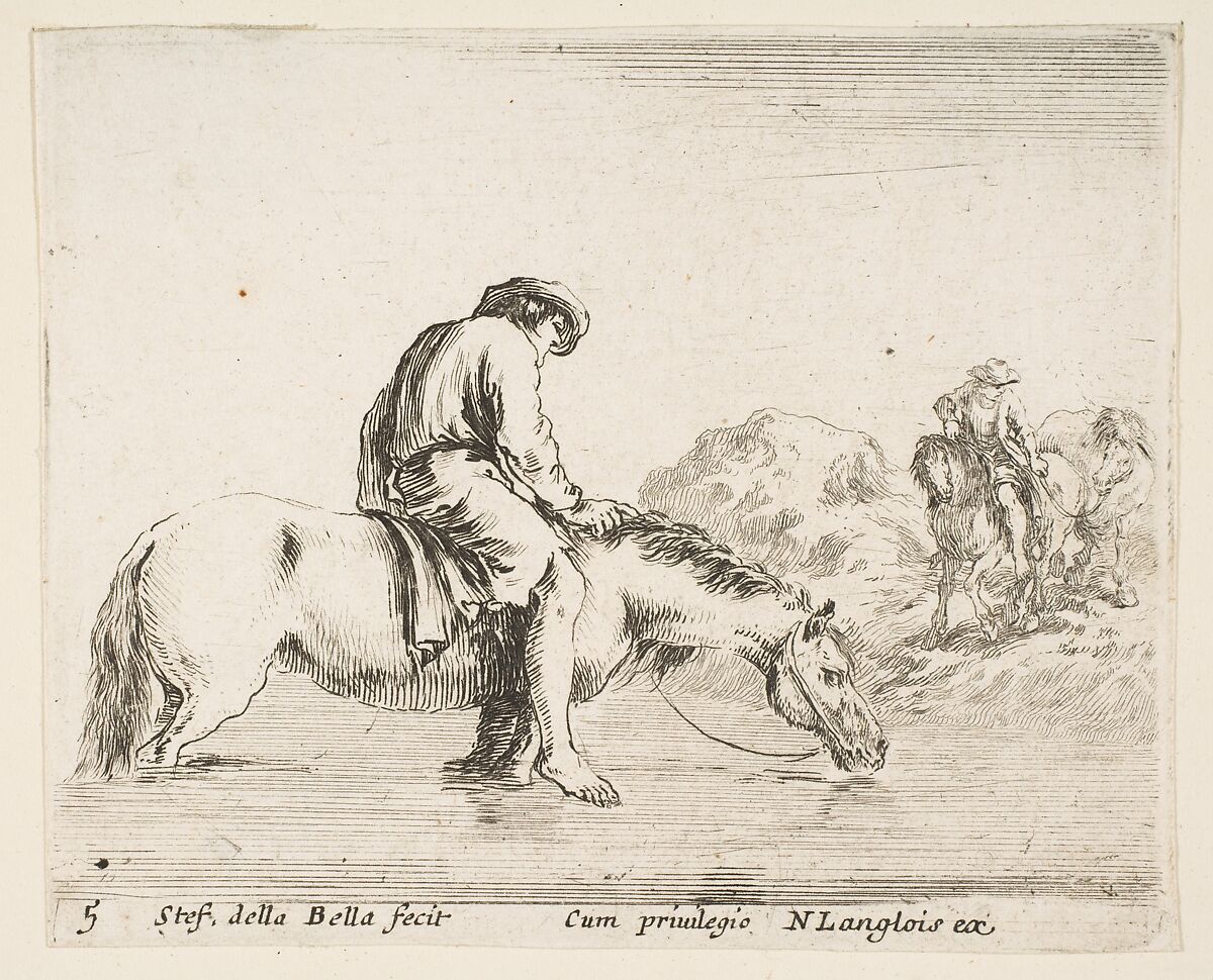 - Title: A barefoot peasant on horseback crossing a river, another peasant on horseback and leading a horse on a bank to right in the background, plate 5 from "Diversi capricci"