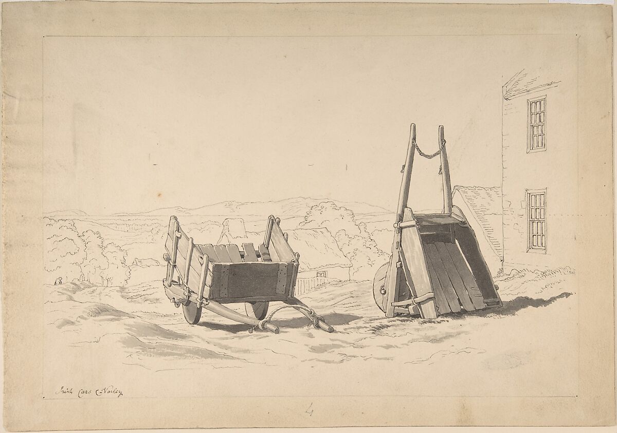 An inscription at lower left indicates that Varley made this drawing in Ireland. Two hand-carts made out of rough planks rest at different angles in a rural yard near a two-storey building, with small structures roofed in tile and thatch beyond. Pen and ink over graphite has been applied to describe the buildings and landscape, with wash added to detail the carts. Brother to the well-known watercolor teacher John Varley, Cornelius was himself a skilled draftsman and watercolorist, and became known for inventing the Graphic Telescope, an optical device that helped artists achieve correct perspective.