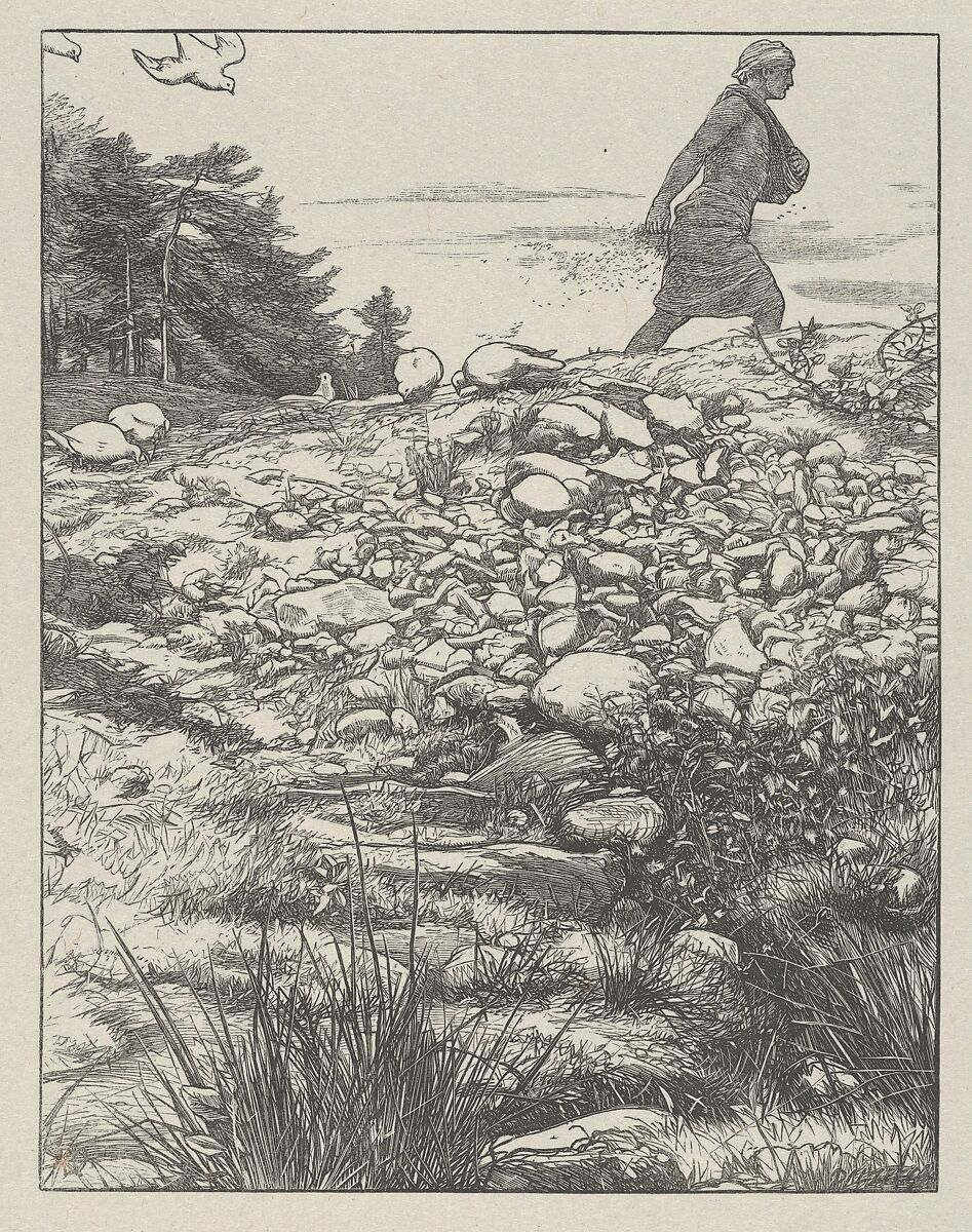 The Parable of the Sower (Matthew 13:1-8) describes how seeds scattered on different grounds meet different fates, and Millais shows some eaten by birds and others falling on rocky soil with the sower silhouetted against the sky. Pre-Raphaelite ideals shaped the combination of detailed naturalism and down-to-earth imagery to produce a work distinctly different than most religious art of the period.