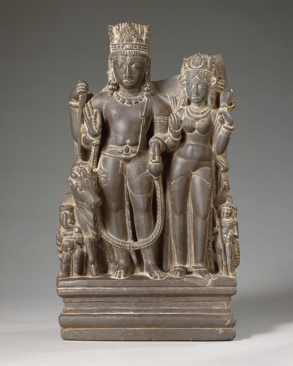 A devotee used this charming rendering of the Shiva family assembled on a single pedestal for worship, likely in a private chapel. Shiva holds a rosary (aksamala) and flask; his wife, Parvati, a mirror. Both are crowned and jeweled as if Kashmiri monarchs. Shiva’s calf bull Vrsabha nuzzles close to his lord, and the couple’s two children flank the ensemble.