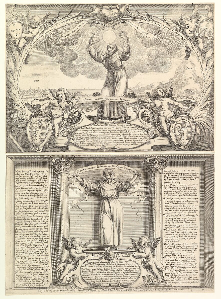 This exceedingly rare print was made for a theological thesis defense that took place in Rome’s Franciscan convent of Santa Maria in Aracoeli in 1639. The event was dedicated to the Spanish jurist and diplomat Buenaventura de Salinas y Córdoba (1592–1653) and celebrated the Spanish friar Francis Solano (1549–1610), a Franciscan missionary who spent his life among indigenous populations in the Viceroyalty of Peru. In the top sheet, Solano is shown with his arms raised, as if supporting the sun that rises between Peru’s two most important cities: Lima, its capital, and Potosí, whose abundant silver mines were the principal source of Spain’s wealth in the period. In the bottom sheet, the sixteen theses to be disputed flank an image of the seminal Franciscan theologian Duns Scotus (1266–1308).