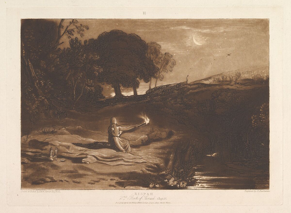 Turner distilled his ideas about landscape In "Liber Studiorum" (Latin for Book of Studies), a series of seventy prints plus a frontispiece published between 1807 and 1819. To establish the compositions, he made brown watercolor drawings, then etched outlines onto copper plates. Professional engravers usually developed the tone under Turner's direction, and Dunkarton here added mezzotint to describe a gruesome Old Testament subject. After the death of King Saul, his sons by his concubine Rizpah were executed by the Gibeonites, and left unburied. Their mother here protects the corpses, using a torch to ward off an approaching lion at night. The letter "H" in upper margin indicates Turner's category of Historical landscape.