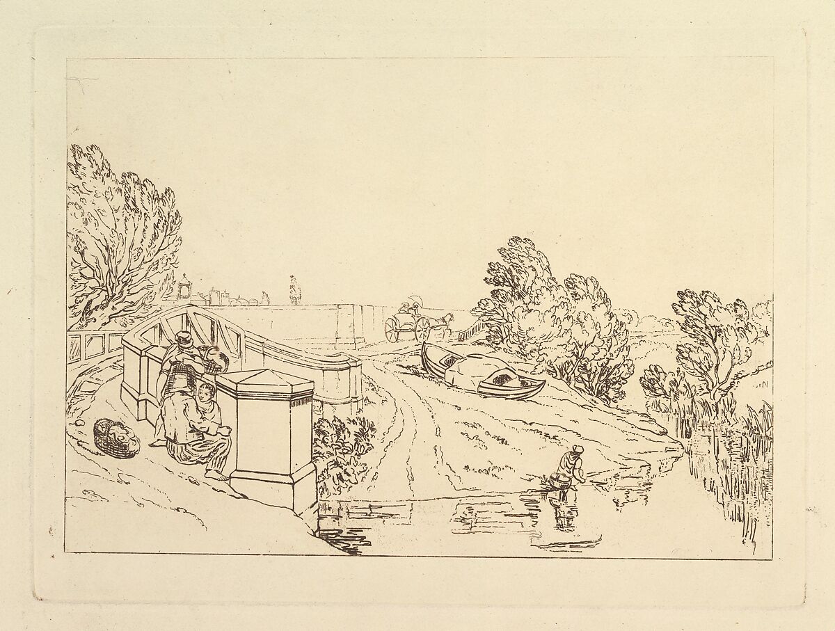 Turner distilled his ideas about landscape In "Liber Studiorum" (Latin for Book of Studies), a series of seventy prints plus a frontispiece published between 1807 and 1819. To establish the compositions, he made brown watercolor drawings, then etched outlines onto copper plates. Here we see his preliminary work on a plate that Thomas Lupton later completed in mezzotint. The rural English scene shows a woman picking cress in a stream near two children as figures with baskets rest at the end of a bridge, and a horse-drawn gig move away down a road next to a wall.