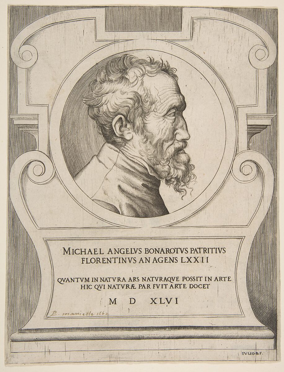 - Title: Bust portrait of Michelangelo facing right, set within a cartouche