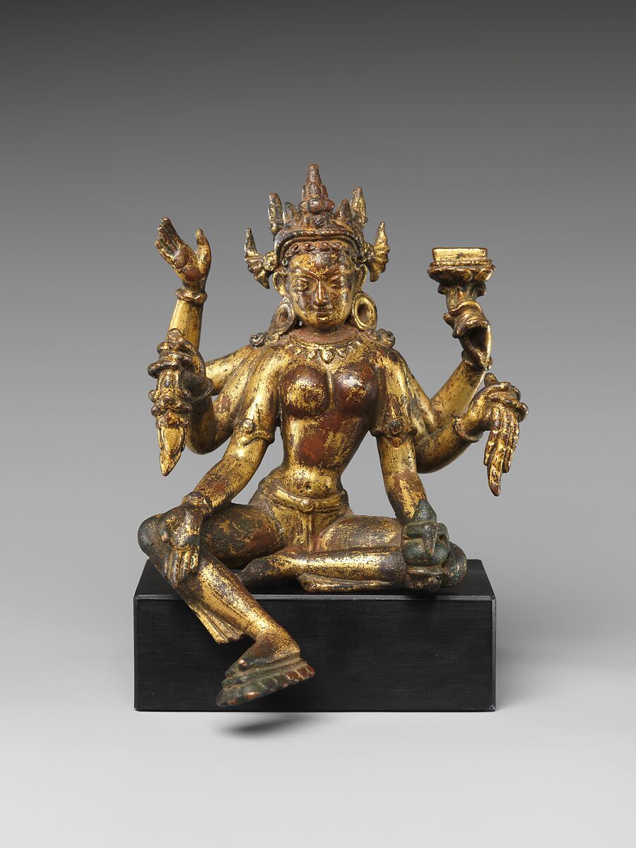 The Vasudhara-kalpa ritual text describes the six-armed Vasudhara (Sanskrit: “stream of gems”) as a goddess of wealth, golden in color, who sits in royal ease holding her lower right hand in a boon-granting gesture (varada mudra) while jewels flow from her left.