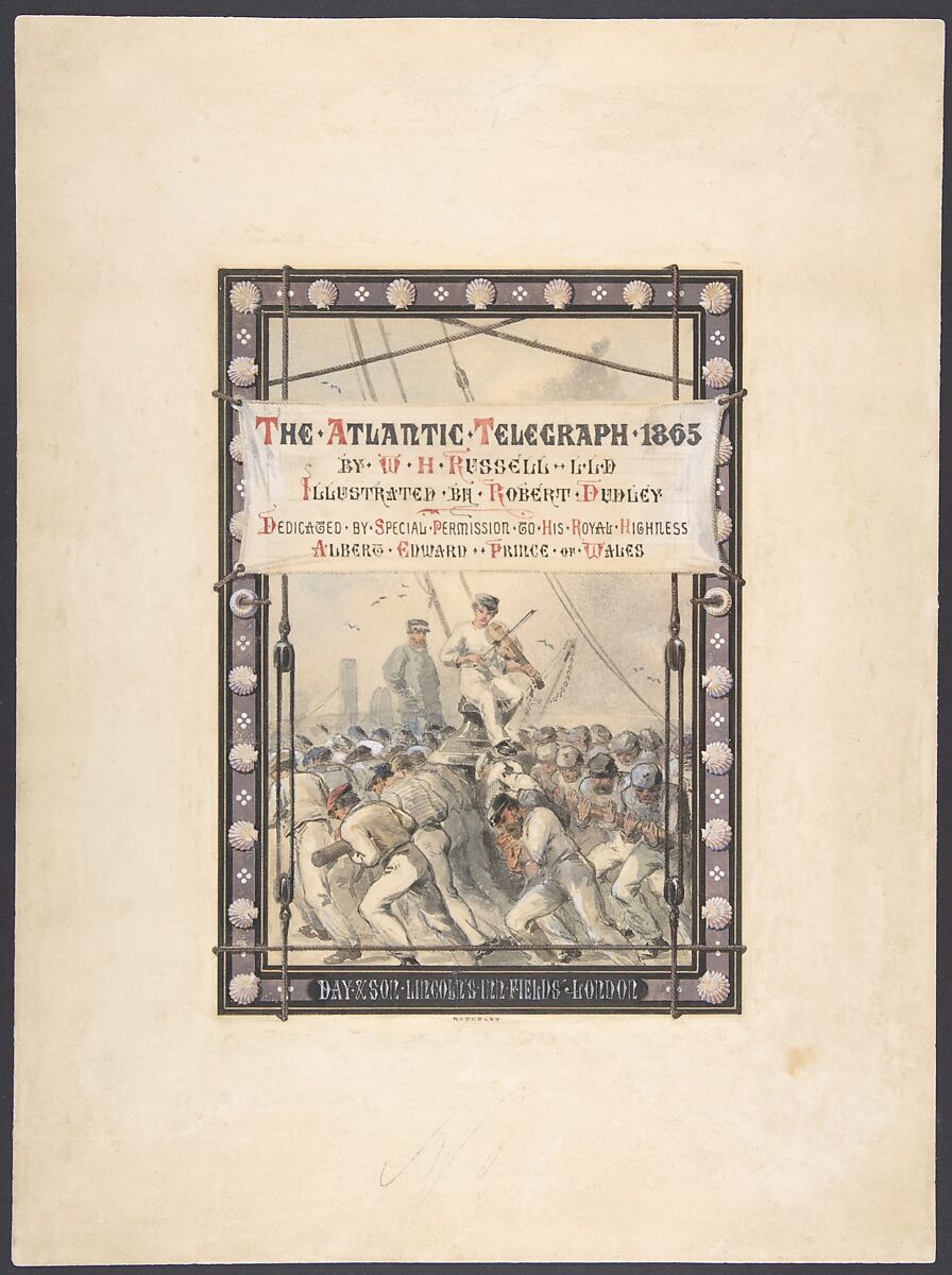 One of the 19th century's great technological achievements was to lay a telegraphic cable beneath the Atlantic, allowing messages to speed back and forth between North America and Europe in minutes, rather than ten or twelve days by steamer. An initially successful attempt in 1858, led by Cyrus W. Field and financed by the Atlantic Telegraph Company, failed after three weeks. Two working cables were finally laid in July and September 1866, the result of repeated efforts by the indefatigable Field, a cadre of engineers, technicians, and sailors, two groups of financial backers, and significant help from the British and United States navies.Dudley here shows sailors winching up the Great Eastern's huge anchor as the ship sets out from the English coast in July 1865 to lay a land end of the cable in Ireland then set out for Newfoundland. The image was reproduced as the title page of William Howard Russell's 1866 book "The Atlantic Telegraph" (92.10.100 and 61.536.5). In 1892, Field donated art works by Dudley, a copy of Russell's book, commemorative medals, memorabilia, and specimens of cable to the Museum.
