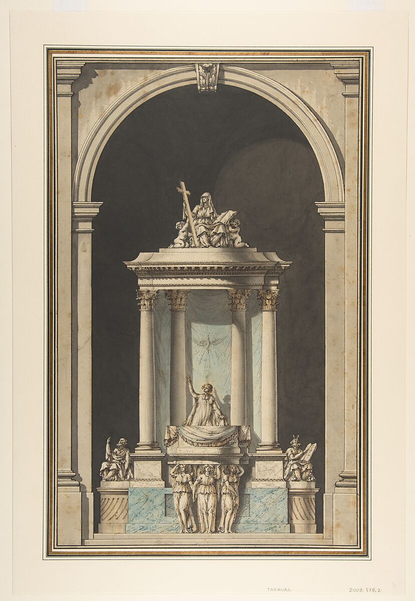 Together with a second drawing in the collection, this drawing by Taraval shows ideas for the design of a pulpit. While they could represent an exercise, created without a specific location in mind, there is some evidence to suggest that they were, in fact, meant for the church of Saint-Sulpice in Paris. The church’s existing pulpit was built during Taraval’s lifetime after the design of his contemporary, the architect Charles de Wailly. The close correspondence between the sculpture crowning this structure and the two variants presented in Taraval’s drawings may indicate that Taraval had hoped to gain the commission himself. This suspicion seems to be confirmed by a related design by Taraval for the organ tribune in the same church.