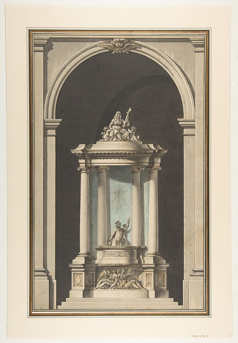 Together with a second drawing in the collection, this drawing by Taraval shows ideas for the design of a pulpit. While they could represent an exercise, created without a specific location in mind, there is some evidence to suggest that they were, in fact, meant for the church of Saint-Sulpice in Paris. The church’s existing pulpit was built during Taraval’s lifetime after the design of his contemporary, the architect Charles de Wailly. The close correspondence between the sculpture crowning this structure and the two variants presented in Taraval’s drawings may indicate that Taraval had hoped to gain the commission himself. This suspicion seems to be confirmed by a related design by Taraval for the organ tribune in the same church.