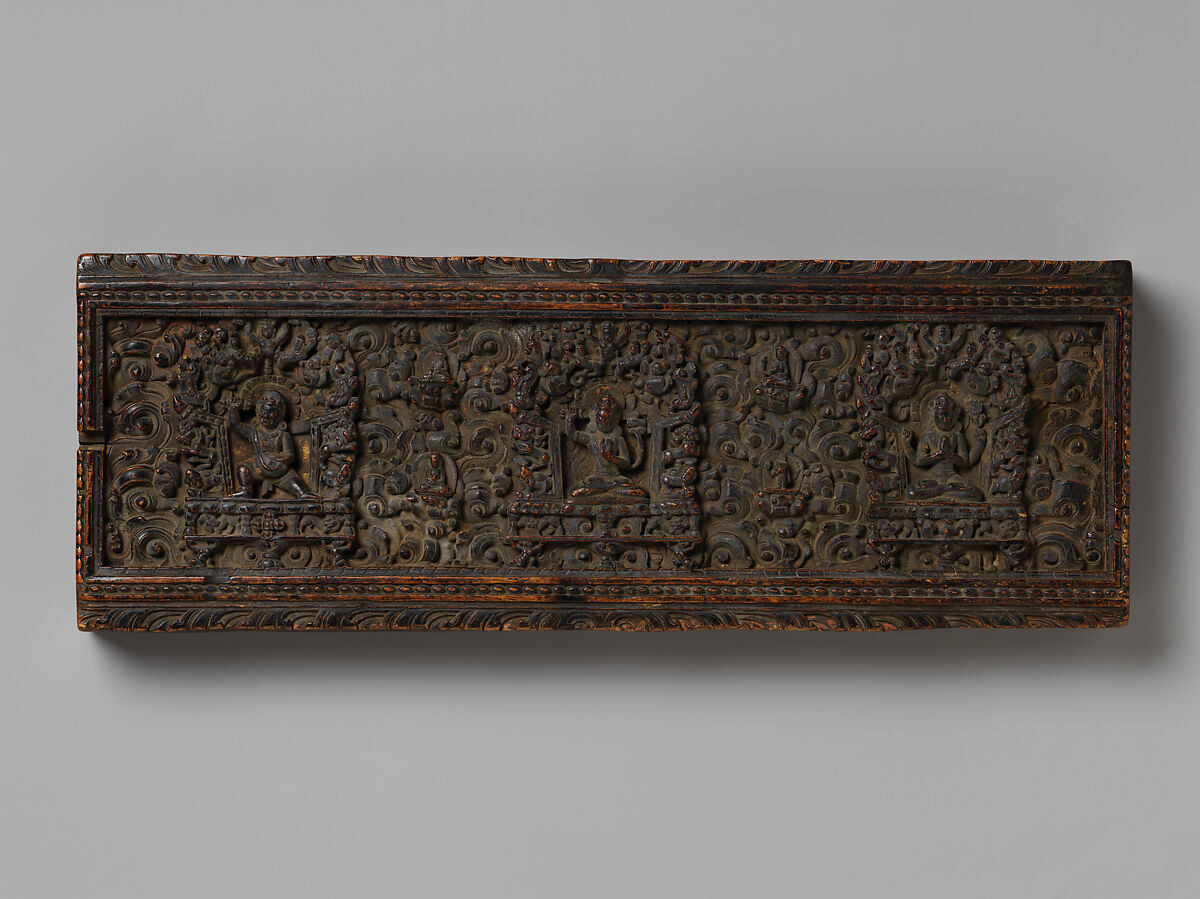 - Title: Manuscript Cover with the Bodhisattva Manjushri Flanked by Vajrapani and Avalokiteshvara