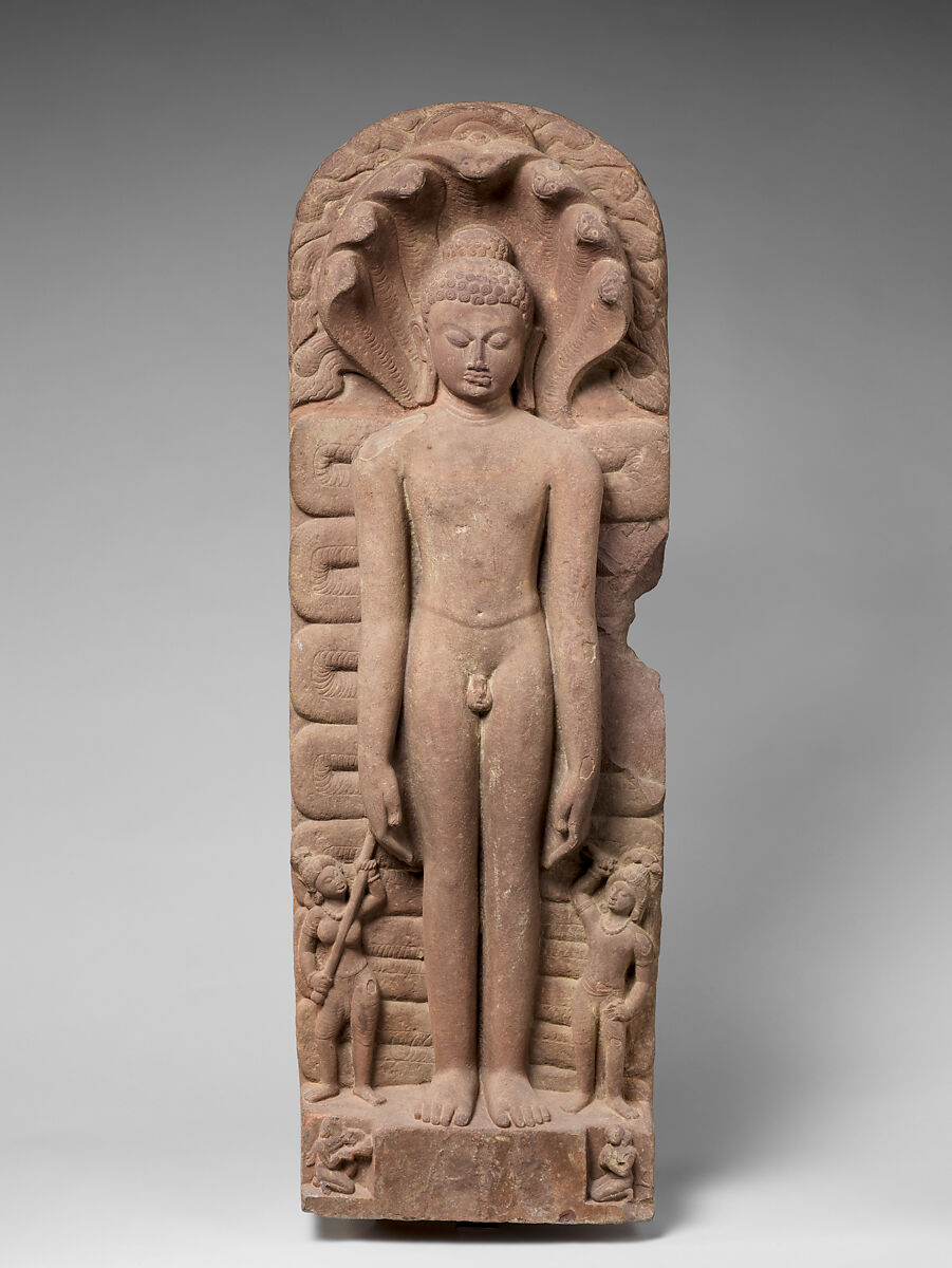 Parshvanatha lived in the ninth century B.C. He became revered as one of the great saviors, or tirthankaras of the Jain religion, one of the three great religions of India. Parshvanatha can be identified by the seven-headed cobra that shelters him while he stands meditating. Two attendants—Padmavati, holding a fan, and Dharana, holding an umbrella—stand to either side. Presumably, the tiny figures at the bottom of the relief are its two donors.