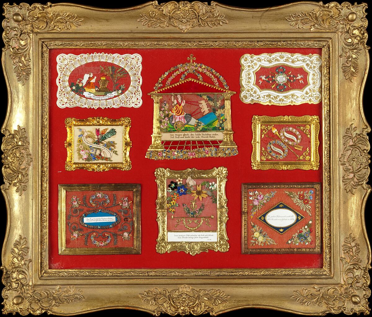 - Medium:Gouache on card, cut and embossed paper with printed or inscribed mottoes, silk gauze, gilded paper borders, all mounted on red silk, framed