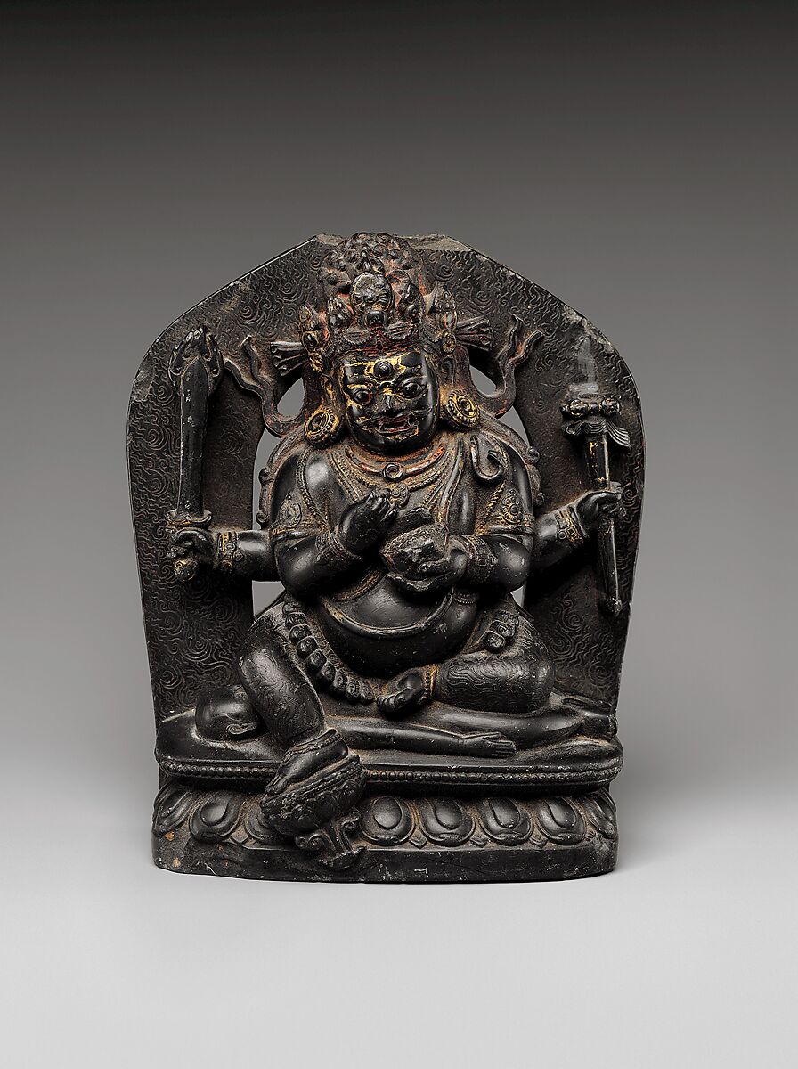 Mahakala, a fierce manifestation of the compassionate bodhisattva Avalokiteshvara, is the supreme guardian of the Buddhist dharma (teachings) for the Sakya monastic order. His wrathful nature destroys all negative forces impeding spiritual awakening. Here Mahakala is seated on a prostrate corpse, symbolizing the ignorance he destroys and displaying the tools he uses to achieve this end.