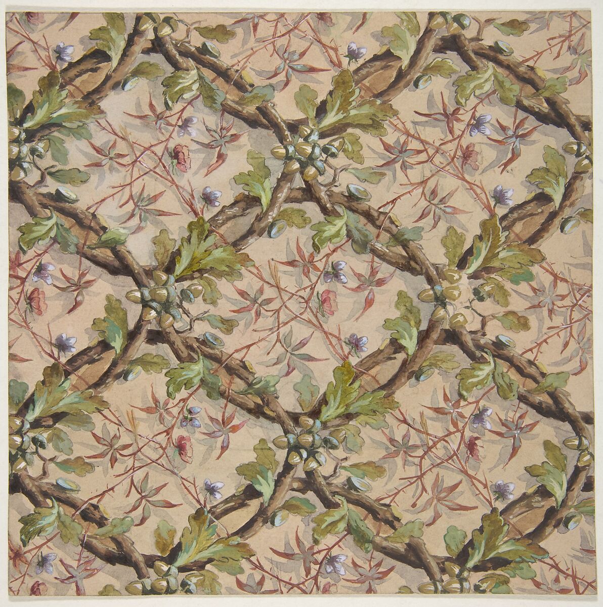- Title: Design for wallpaper featuring oak leaves, acorns, and intertwined twigs