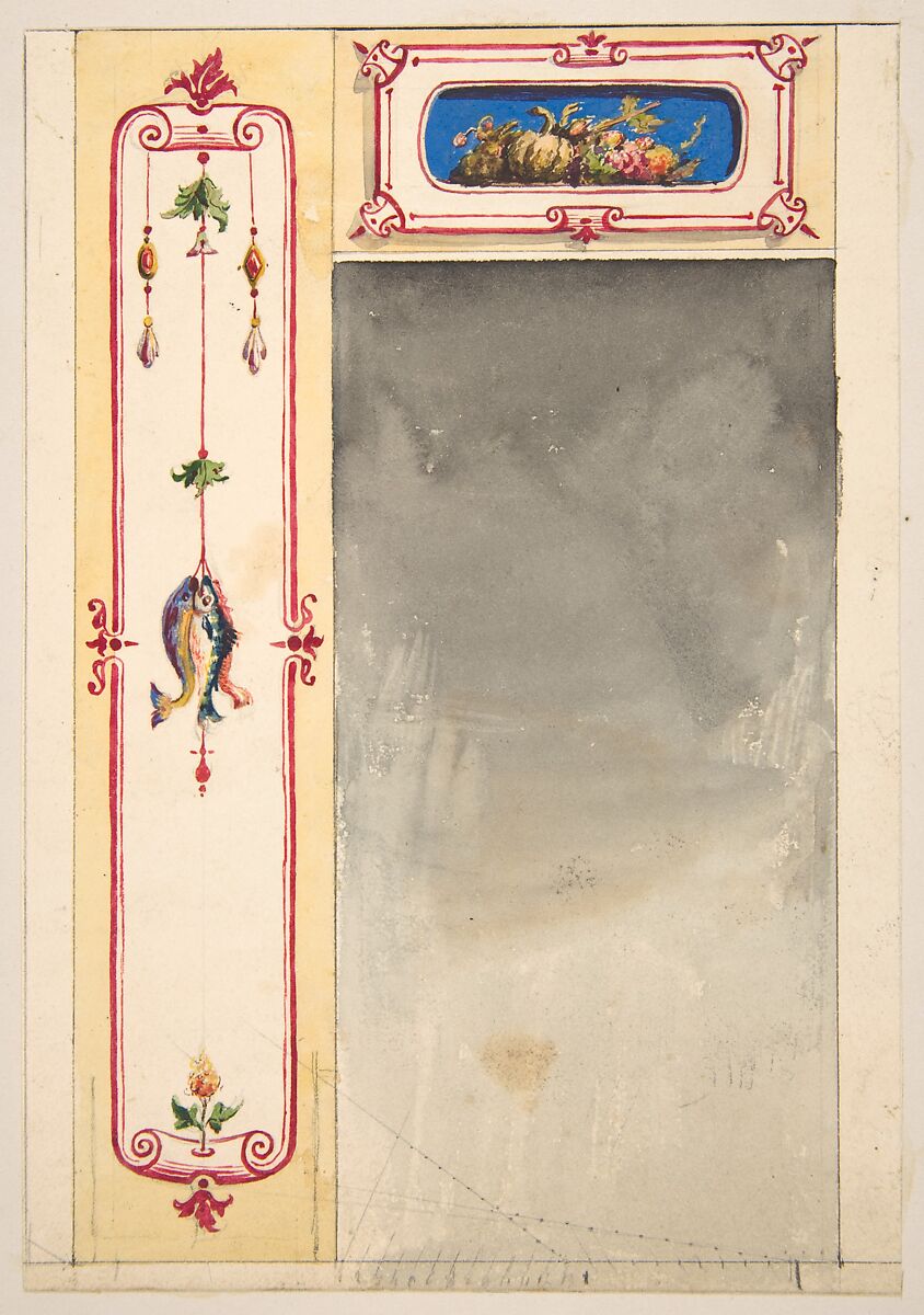 - Title: Design for panels framing a mirror decorated with scrolls and clusters of fish and vegetables