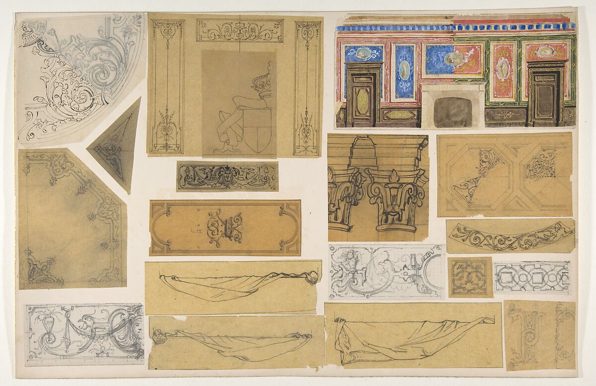 - Medium: graphite, pen and ink, watercolor, and gold paint on various papers; mounted on cardboard