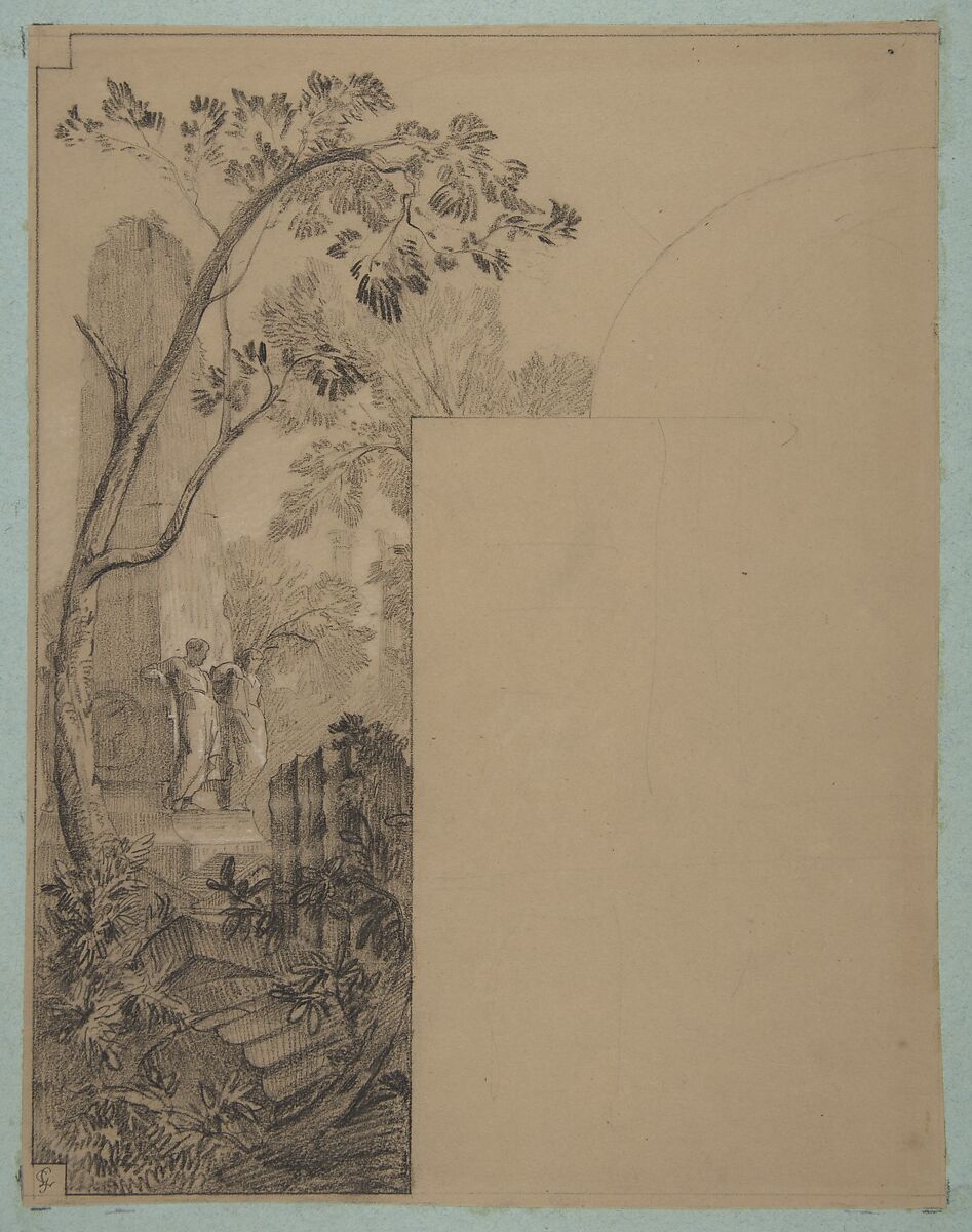 - Title: Design for mural decoration surrounding a door: landscape with classical ruins