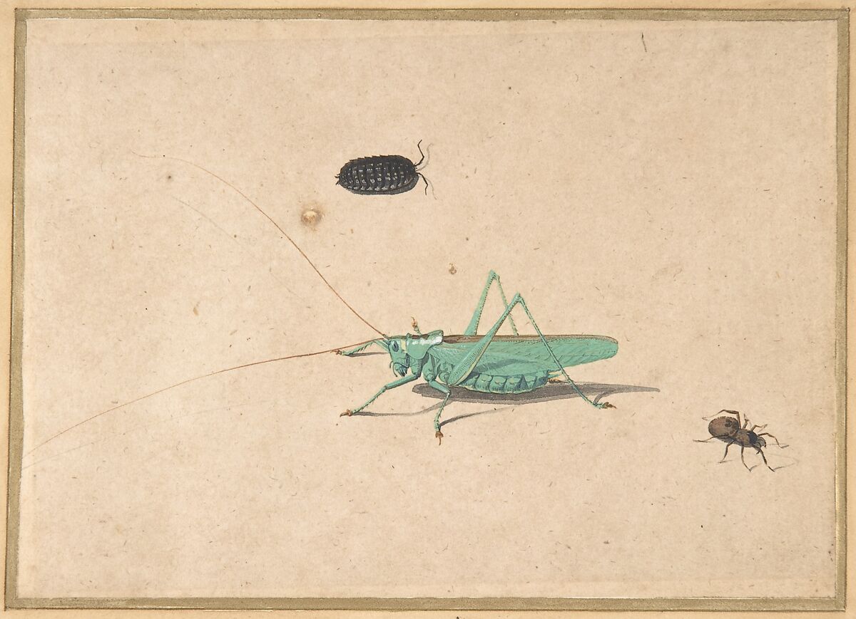 The advent of the microscope in the early seventeenth century revolutionized the manner in which people saw insects. In about 1600, ants, bees, and butterflies garnered most scholarly attention, owing to their significance in biblical and classical sources. By the eighteenth century, the range of insects that were subjects of study had expanded in tandem with a new interest in understanding insects’ anatomies. The abrupt end of the green bush cricket’s lower antenna (and its shadow) at the left edge of the sheet suggests that this support may, at some point, have been cut down.