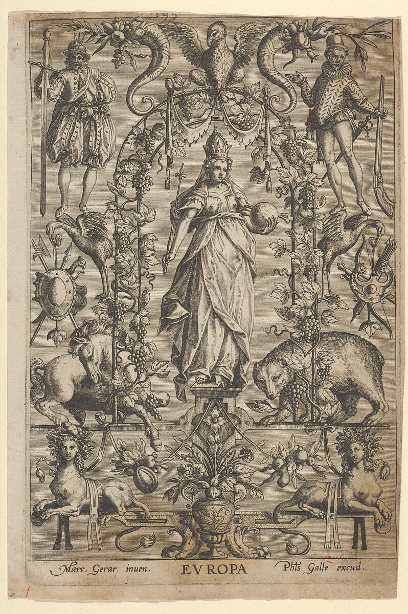 This Allegory of Europe is part of a series of engravings of the four continents after drawings by Gheeraerts. European artists from the Renaissance onwards represented the known world through allegorical figures derived from antiquity. They often took the form of clothed or naked women and were used in ephemeral works made for triumphal entries and pageants, in maps, coins, prints, and the decorative arts. The representations were eventually standardized in the Iconologia by the Italian Cesare Ripa (1593; illustrated in 1603), and supplemented by contemporary travel accounts. In his representations of the Continents, Gheeraerts surrounded the allegories -- sexualized young women -- with the symbols and attributes that the artists and the viewers associated with each continent—in some cases the commodities to be traded and resources to be exploited. These images, steeped in a white Christian and male Eurocentrism, reinforced ideas of the self and the other that characterized the era.