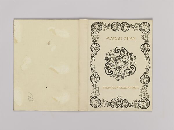 A leading New York book-cover designer in the late nineteenth century, Morse studied at the Woman’s Art School of the Cooper Union, then under John La Farge before working for Louis C. Tiffany as a painter and designer of stained glass. In 1887 she began to concentrate on book-covers, fufilling eighty-three commissions for New York commercial publishers by 1905. Complementing the text, she chose imagery ranging from classical, to Renaissance, Celtic, Arabic, Gothic, Rococo, Arts and Crafts and Art Nouveau. This example is bound in warm-white plain-weave cloth stamped in brown and gold and uses Art Nouveau ornament. "Marse Chan" comes from a four-title set of works written by Thomas Nelson Page, none of which include stamping on the spine.