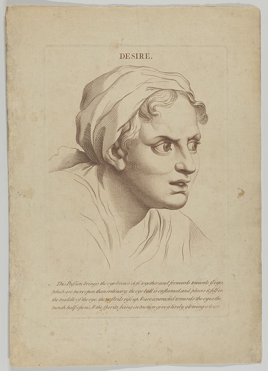 - Title:Desire, plate 8 from "Heads Representing the Various Passions of the Soul; as they are Expressed in the Human Countenance: Drawn by that Great Master Monsieur Le Brun"