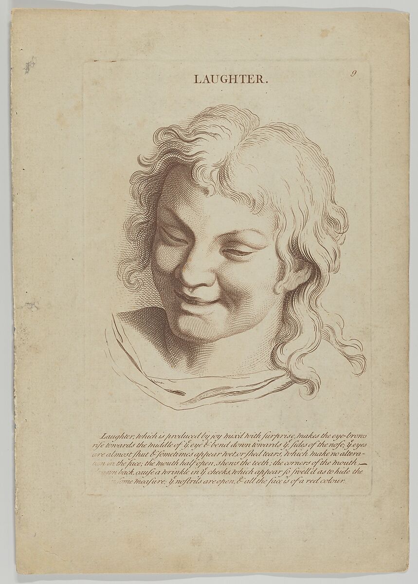 - Title:Laughter, plate 10 from "Heads Representing the Various Passions of the Soul; as they are Expressed in the Human Countenance: Drawn by that Great Master Monsieur Le Brun"