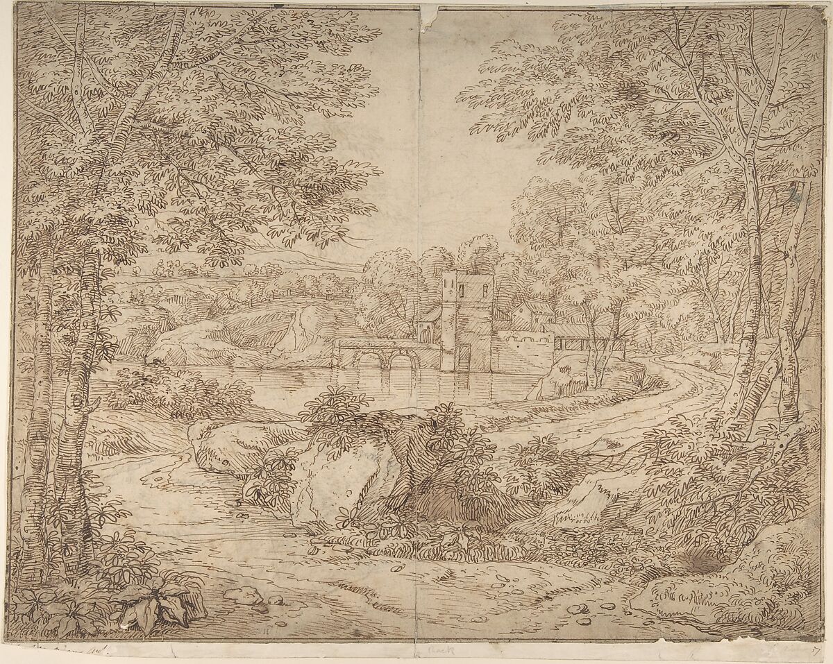- Title: Ancient buildings next to water in the woods (recto); A variation of the same landscape in reverse (verso)