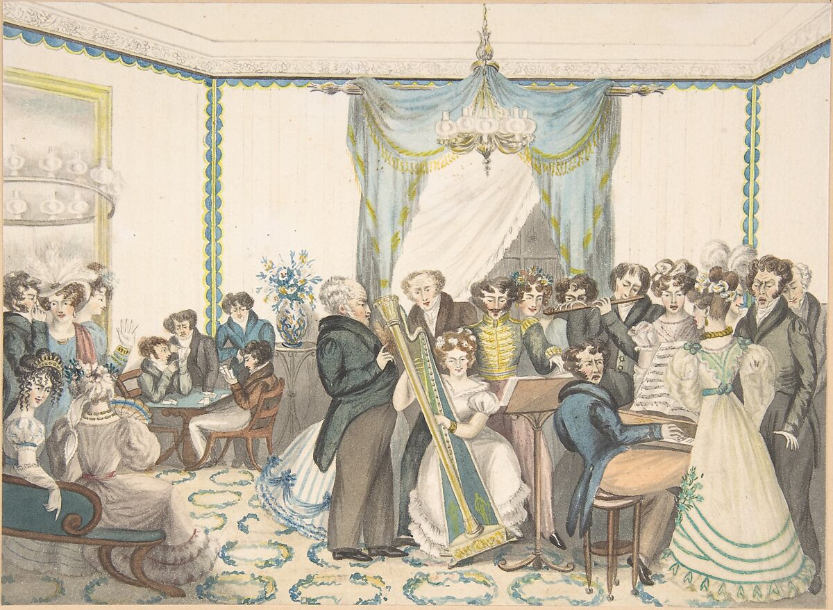 This amateur watercolor records an interior in Dr. Samuel Parr's substantial parsonage at Hatton, where he lived for three decades and ran a small private school for boys. Here men and women gather for an evening party with musicians playing a harp, flute and harpsichord as seated guests converse and play cards. The styles of dress and furnishings suggest a date in the 1820s.