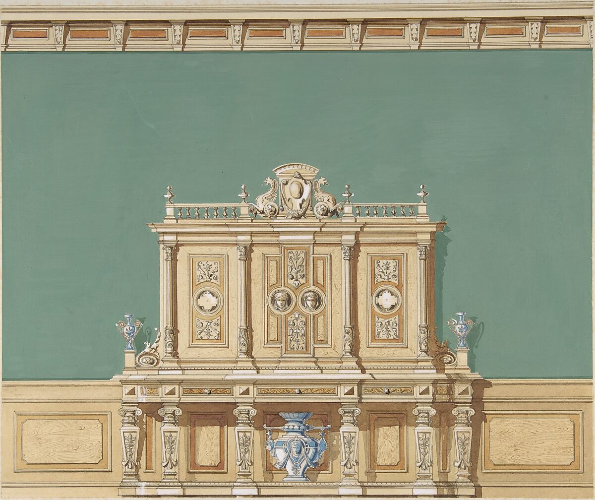 - Title: Interior Design with a Large Renaissance Style Cabinet against a Green Wall